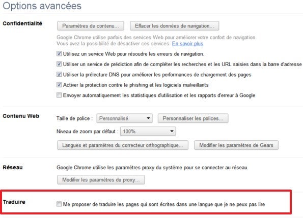 3. Une fois dans les options avancées, allez à la partie Traduire et décochez la case Me proposer de traduire les pages qui sont écrites dans une langue que je ne peux pas lire.