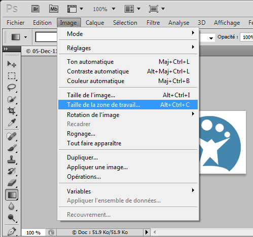 2. Comme nous allons multiplier par 2 la taille de l’image en créant l’effet miroir, il faut doubler au préalable la taille du calque. Pour ce faire, rendez vous sur l’onglet “Image” puis “Taille de la zone de travail”.