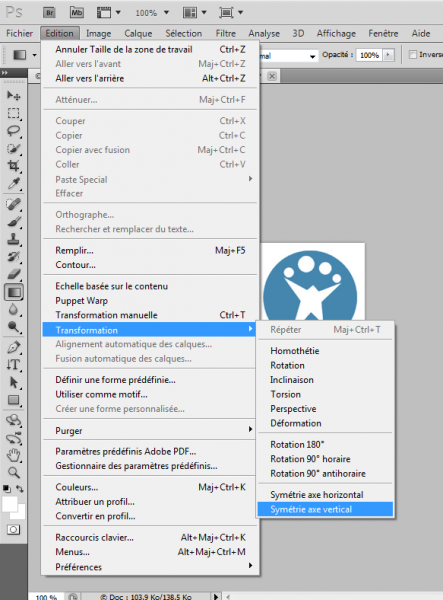 4.Il vous faut maintenant créer un effet de miroir. Cliquez sur “Edition” > “Transformation” > “Symétrie axe vertical”.
