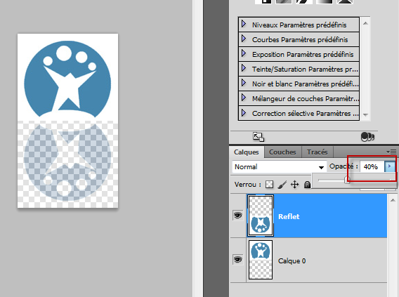 6. Après avoir correctement positionné les calques, vous pouvez ajouter un effet de transparence au reflet. Sélectionnez le calque correspondant puis, dans la partie supérieure de l’écran, réglez l’opacité sur 40%.