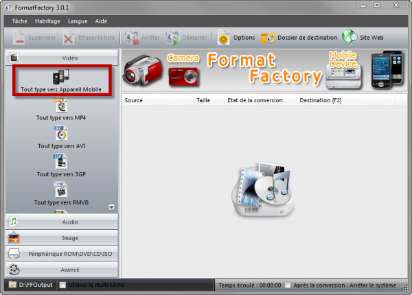 1 – Dans l’interface de Format Factory, sélectionner “Tout type vers Appareil Mobile”.
