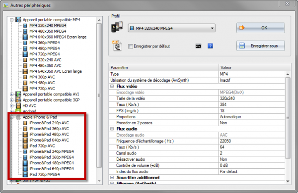2 – Dans le menu déroulant, vous trouverez les options pour convertir vos vidéos dans les formats compatibles avec l’iPad et l’iPhone. Deux formats de sortie sont proposés (AVC et MPEG4) avec plusieurs niveaux de qualité allant de 240p à 720p.