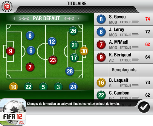 L’interface de gestion d’équipe est disponible via 3 portes d’entrées compartimentées pour FIFA 12: Tireurs, Titulaires et Styles. La première permet de sélectionner les tireurs de coup de pied arrêtés, en fonction de leur bon pied, ainsi que le capitaine. Le troisième, nous venons de l’expliquer dans le paragraphe précédent. Le deuxième permet de modeler son équipe et d’installer les joueurs à des postes de titulaire ou remplaçant. le terrain est à gauche, la liste des joueurs disponibles à droite. Les changements se font en choisissant le numéro du joueur et en le faisant glisser sur l’écran de façon intuitive. Ces même joueurs sont évalués selon une note générale de 0 à 100.