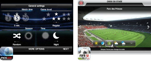 FIFA 12 permet de faire exactement la même chose à quelques nuances près. On peut choisir la durée du match (2, 3, 4, 6, 8 ou 10 minutes), la difficulté de l’adversaire (5 niveaux de débutant à International), la météo et l’heure du match (diurne, nocturne, sous le soleil, la pluie ou la neige). Le bébé d’Electronic Arts met les petits plats dans les grands avec un choix à faire parmi 46 stades connus et 26 sortes de ballons officiels jouer le match. Non négligeable, FIFA 12 permet de régler la hauteur de la caméra pour visionner le match.