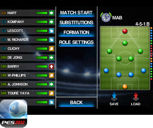 PES 2012 conserve l’interface de gestion d’équipe qui a fait son succès dans notre comparatif 2011, à savoir une seule et même page pour tout gérer, où tout est visible très rapidement. A gauche sont disponibles les titulaires, à droite, le schéma tactique et au centre un menu donnant accès aux tireurs de coups de pied arrêtés, aux remplacements et au changement de schéma. Tout est accessible rapidement et très simplement. L’interface aurait sans doute gagné en efficacité si le glisser-déposer avait été de mise, plutôt que la sélection d’un titulaire, puis d’un remplaçant, et enfin d’une confirmation. 3 taps, c’est laborieux. Côtés joueurs, ce sont 30 notes qui sanctionnent les caractéristiques techniques et physiques de chaque joueur. De quoi vraiment jouer sur les points forts et faibles de chacun.