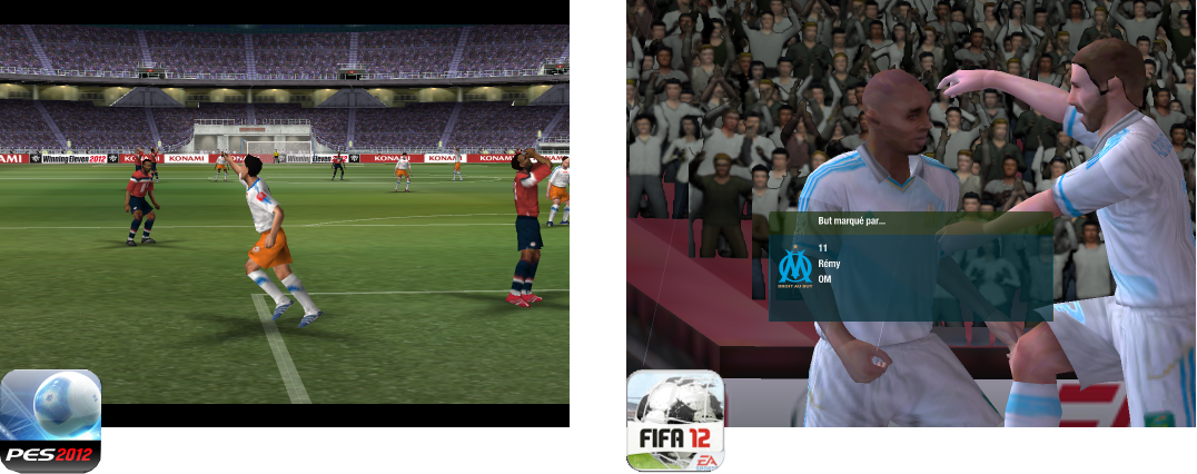 A nos yeux, il convient de séparer l’étude des graphismes en deux parties: dans le jeu et dans les cinématiques. En match FIFA 12 et PES 2012 s’en tirent à merveille avec les moyens limités que sont ceux de l’iPhone et de l’iPad. On observe un gestuelle très naturelle dans les actions développées sur FIFA 12 avec une belle palette de gestes techniques qui se déroulent sans accros. Côté PES 2012, c’est beaucoup plus figé, plus strict avec des joueurs plus raides et moins de fluidité globale. Un comble quand on sait que PES 2011 avait un coup d’avance dans ce domaine dans notre comparatif de l’an dernier. Mais le résultat reste très agréable.