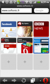 Opera Mobile conserve le Speed Dial qui a fait sa force sur Windows, à savoir différentes pages populaires ou visitées récemment offertes à l’utilisateur au démarrage. Un concept qui s’adapte fort bien au mobile.