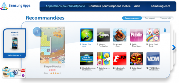 Samsung Apps est un magasin directement intégré dans les mobiles et la télévision. Il offre les meilleures applications, soigneusement passées en revue et sélectionnées pour les appareils Samsung. Samsung Apps est actuellement embarqué sur les téléphones portables et les téléviseurs. Toutefois, le but est de fournir des applications pour tous les autres appareils Samsung afin de permettre une parfaite convergence entre les différentes plate-formes.